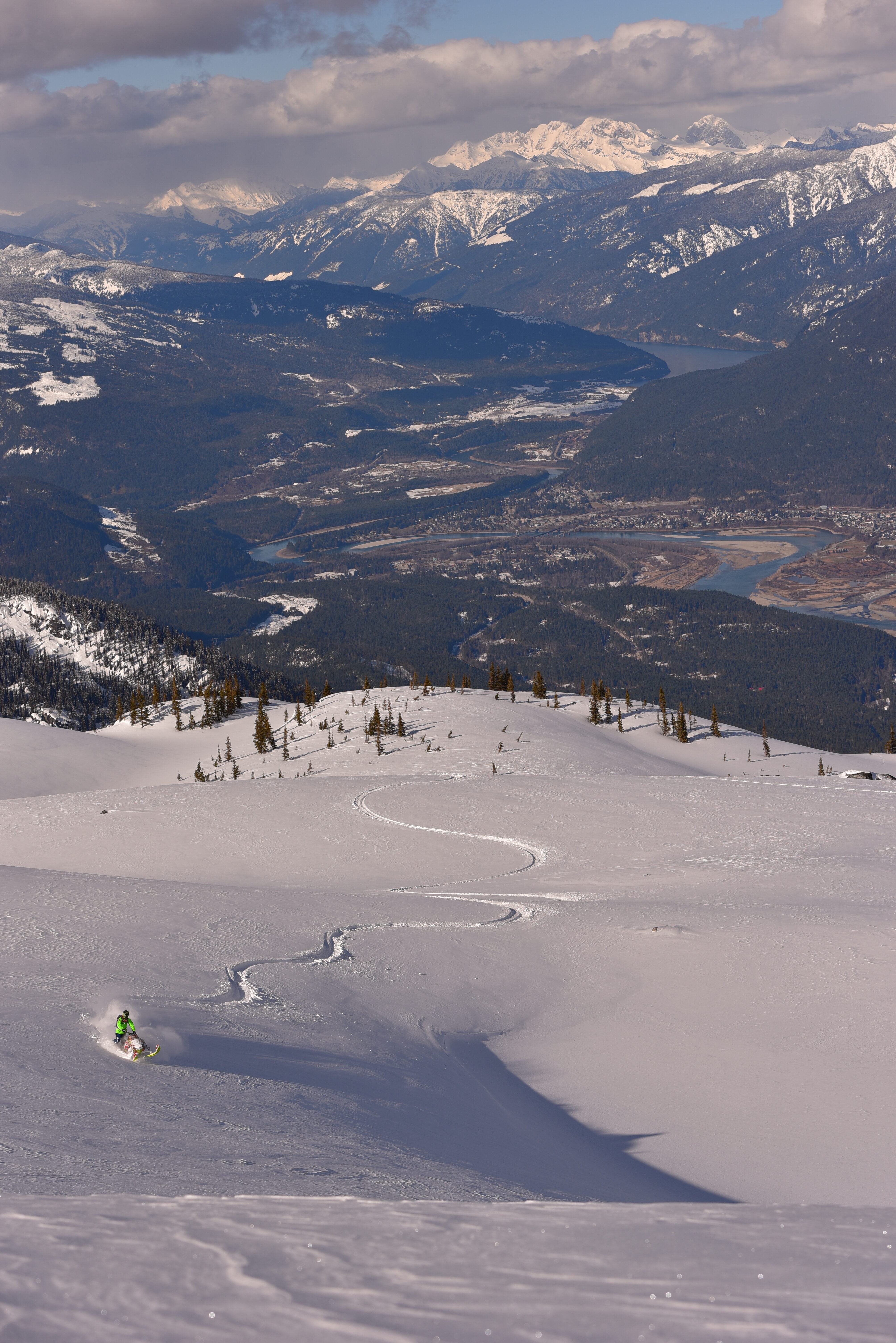 “Mount Begbie is a small zone, but you don’t go there for the size, you go for the experience. It’s the highest and most prominent peak visible from Revelstoke, and likewise has the best view of town from near its summit. It also offers the change to just under a hanging glacier nestled between the towering buttresses of the peak itself. Getting there involves a sketchy ride through an avalanche-ripe valley, but if you pick a beautiful sunny day when the snow pack is stable, the reward can be well worth the risk.” – Sourced from Mountain Sledder Guidebook